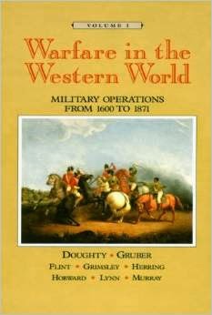 Today, I am going to briefly review the book, Warfare in the Western World: Military Operations from 1600-1871, edited by Robert Doughty and Ira Gruber. I am considering this text for my "War and Culture in the Atlantic World" class in the spring semester. This book is the first volume of a two part series covering warfare from 1600 to the present, this volume covers all of what we would consider the Kabinettskriege period, and a bit more besides. The book is divided into three parts: 1600-1783, 1783-1815, and 1815-1871.